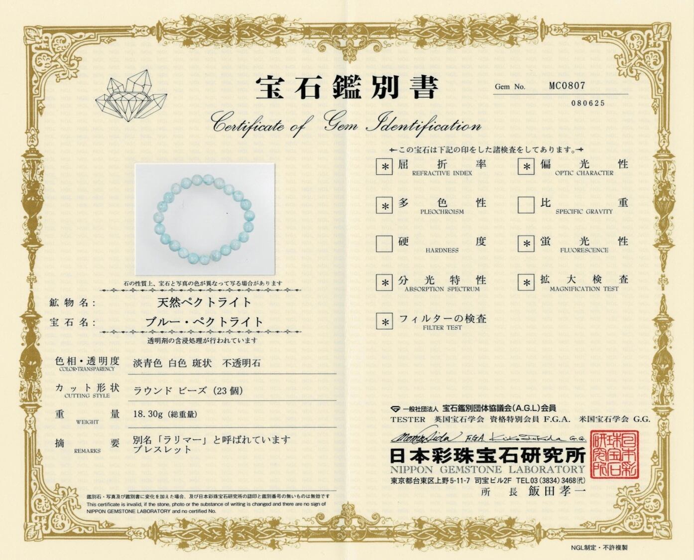 (ドミニカ産) ラリマー 8mm〈MC0807〉鑑別書付きです。